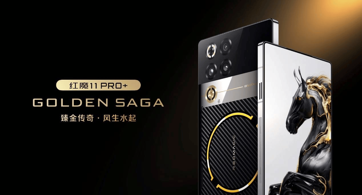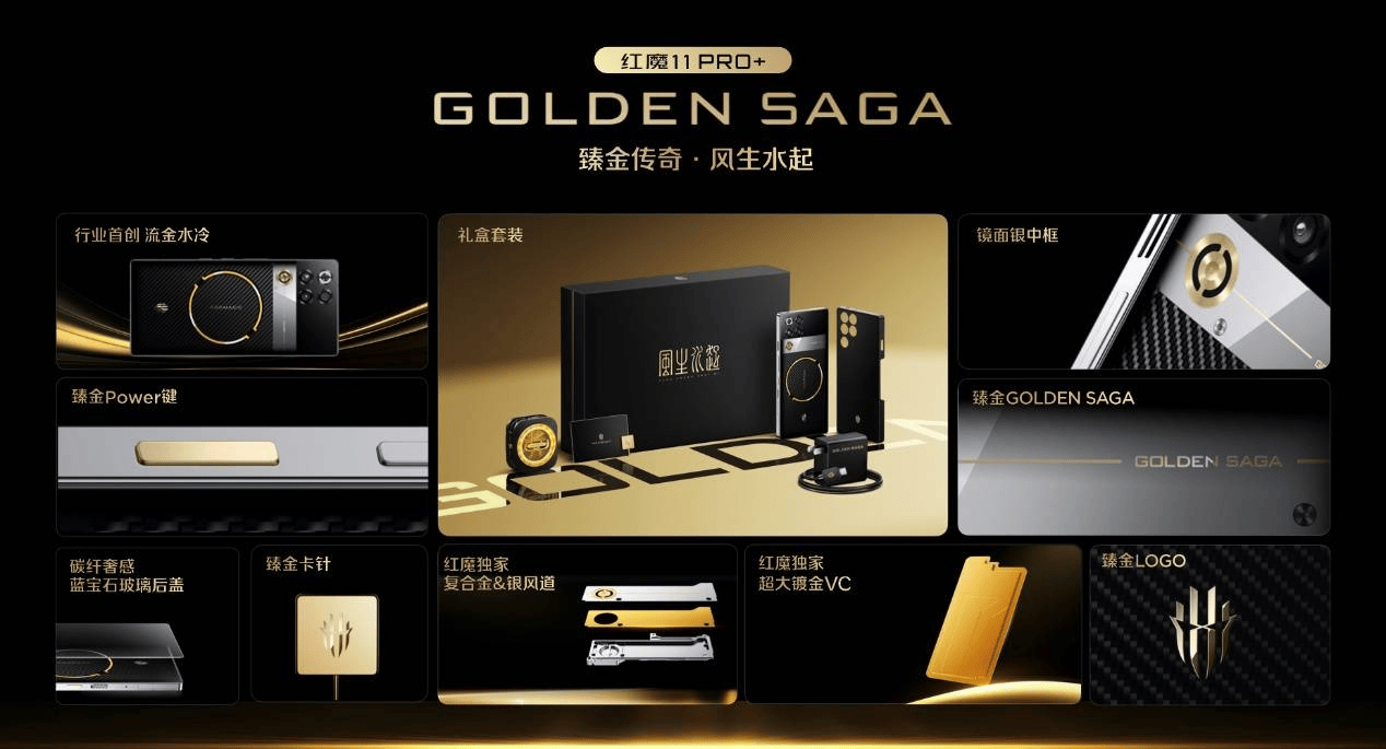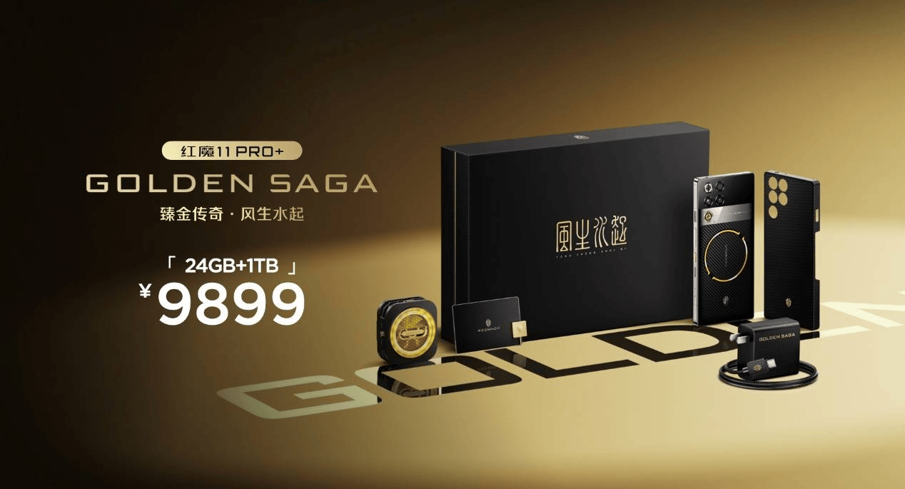 红魔 11 Pro+ 臻金传奇搭载行业独有的24GB+1TB的顶配存储组合,内部配备凯夫拉磁吸保护壳、专属磁吸散热器与臻金卡针、120W魔闪快充等一整套臻金体验,售价为:9899元;