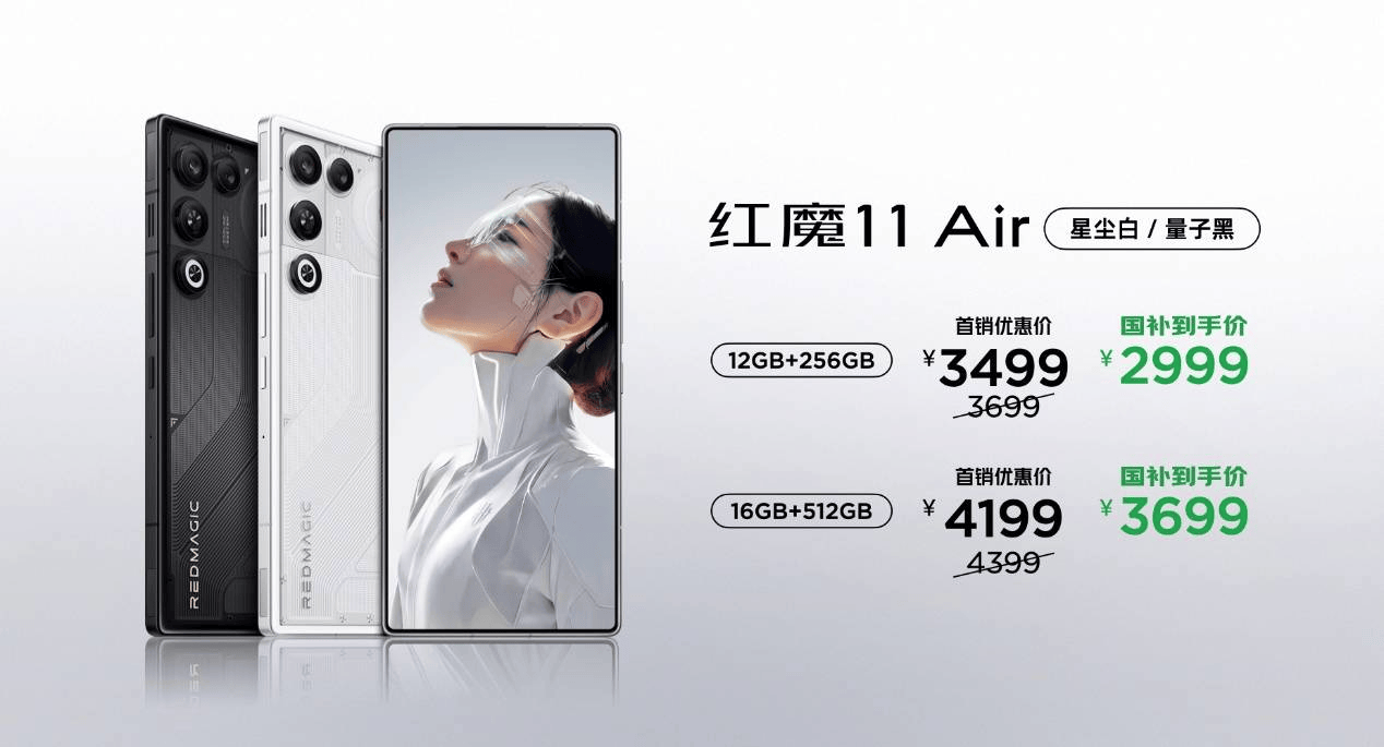 此次红魔11 Air首发推出星尘白、量子黑配色,提供两个存储版本供用户选择:
