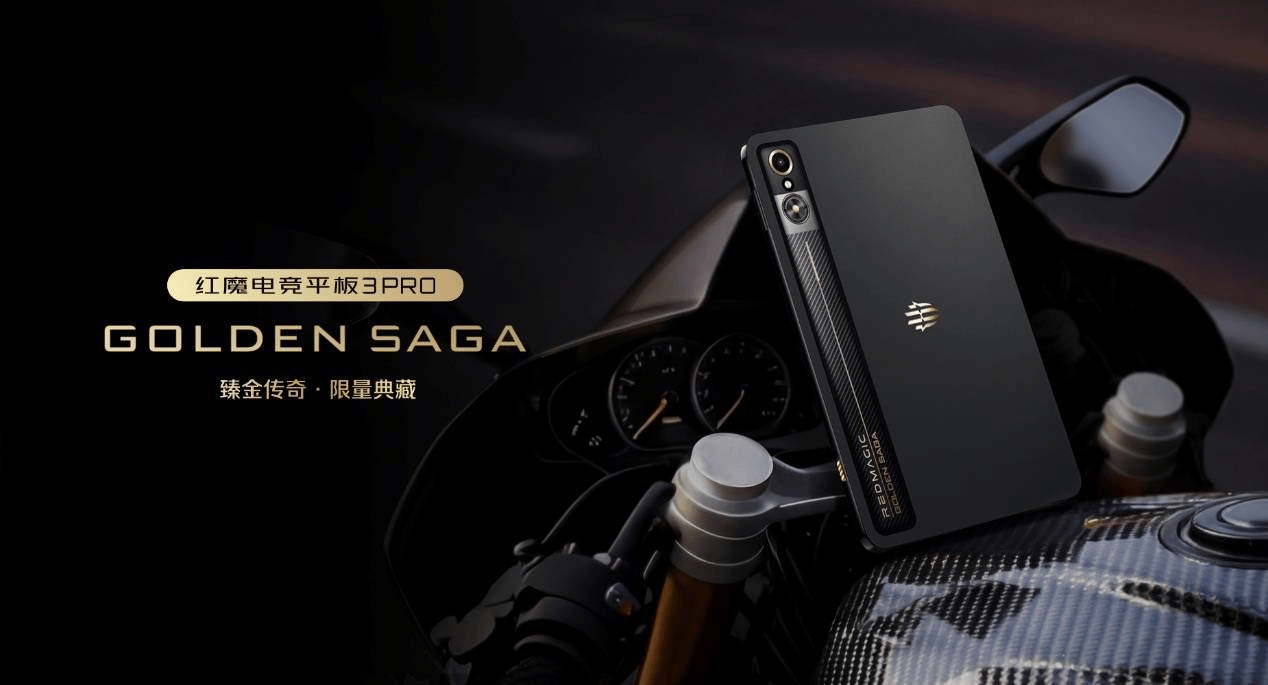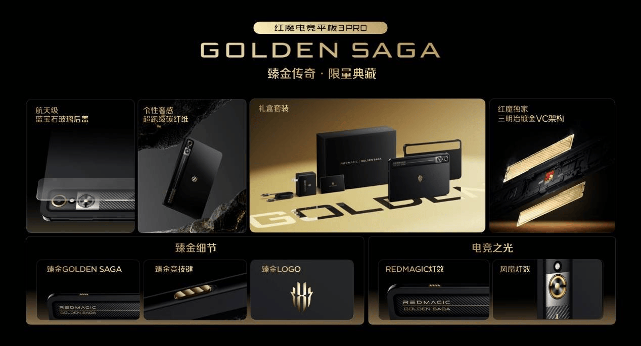 同时红魔为追求顶级电竞体验与奢华质感的玩家,也带来了红魔电竞平板3 Pro 臻金传奇。机身材质同样融合了碳纤维材质与航天级蓝宝石玻璃后盖。机身内部采用镀金VC散热模块,灯效、LOGO、竞技键等都进行了细节处理,让平板也能拥有臻金质感。