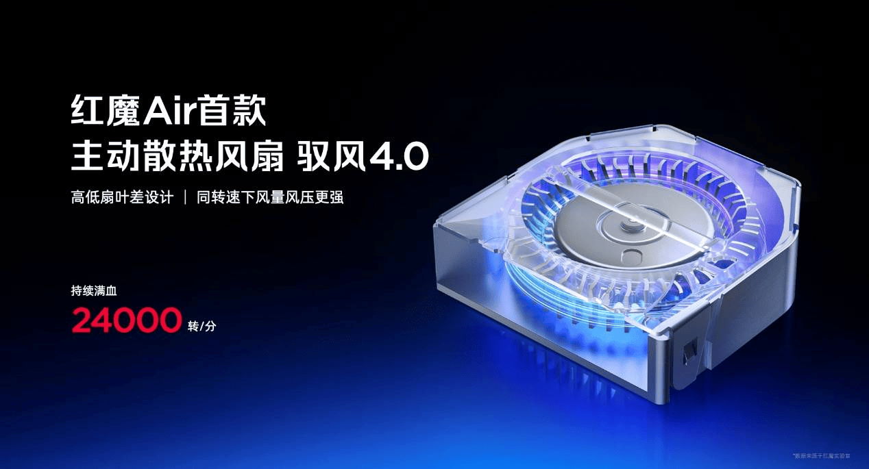 红魔11 Air这一次直接在Air机型上,首次搭载了主动散热风扇——驭风4.0,可实现每分钟24000转持续转速。
